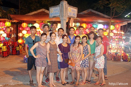 Dứt lòng rời khỏi bãi tắm mê hồn ấy, ăn tối xong chúng tôi lên xe về với phố cổ Hội An – với chợ đêm, chùa Cầu. Ôi! Hội An dưới áng sáng huyền ảo muôn màu của những chiếc đèn lồng, khung cảnh ấy mới lung linh làm sao! Chúng tôi như đắm chìm trong vẻ đẹp của đêm hội Hoa Đăng bên dòng sông Hoài thơ mộng. Tay trong tay với những chiếc đèn Hoa Đăng, mỗi chúng tôi ai ai cũng có những ước nguyện của riêng mình … Cầu chúc sức khỏe, hạnh phúc cho gia đình và người thân, cầu chúc đoàn kết cho tình đồng nghiệp, cầu chúc sự phát triển bền vững cho mái nhà ATO yêu dấu.